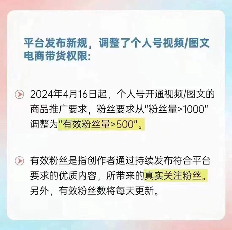 2024年4月16日起,個人號開通視頻/圖文的商品推廣要求,粉絲要求從“粉絲量>1000”調(diào)整為"有效粉絲量>500"。